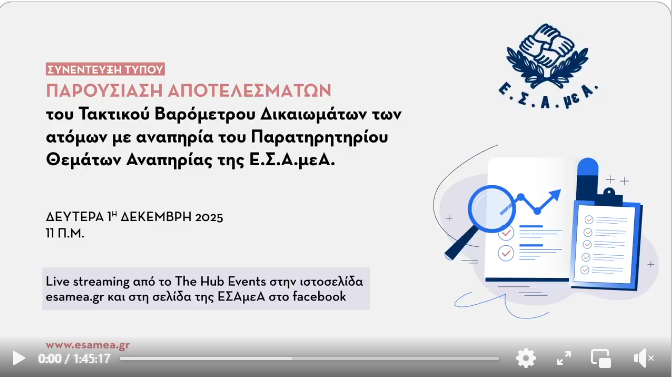 Παρουσίαση αποτελεσμάτων του Τακτικού Βαρόμετρου Δικαιωμάτων των ατόμων με αναπηρία του Παρατηρητηρίου Θεμάτων Αναπηρίας της Ε.Σ.Α.μεΑ.. Δευτέρα 1 Δεκεμβρίου 2025, ώρα 11 π.μ. Παρακολουθήστε ζωντανά…